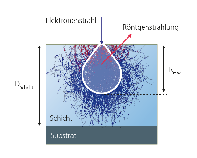 Neben der Analyse der chemischen Zusammensetzung ist bei Schichten kleiner 500 - 1000 nm auch eine Messung der Schichtdicke möglich. Der Elektronenstrahl kann in diesem Fall durch die Schicht bis in das Substrat eindringen. Dies geht sogar bei zwei- oder dreifach Schichtensystemen (vgl. untenstehende Abbildung, links, einer Mehrfachschicht-Analyse). Voraussetzung ist, dass jedes beteiligte chemische Element nur in einer der Schichten oder im Substrat vorkommt, damit die entsprechende Elementstrahlung eindeutig zugeordnet werden kann.