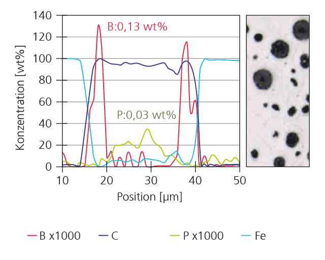 Wenn die Schichten relativ dick, d.h. > 1 µm sind kann die chemische Elementzusammensetzung unabhängig vom Substrat gemessen werden (vgl. nebenstehende Abbildung). Die Nachweisgrenze beträgt dabei ca. 0.01 wt% und die relative Genauigkeit 0.1 wt%. Die Ortsauflösung liegt, durch den fein fokussierten Elektronenstrahl, bei ca. 1 µm. Dadurch können sehr gut ein- und zweidimensionale Verteilung der chemischen Zusammensetzung gemessen werden, bei Schichten > 10 µm auch am Querschliff. Die untenstehende Abbildung (rechts) zeigt einen Querschliff durch ein Stück Gusseisen mit graphitischen Ausscheidungen. Ein Linescan über eine der Ausscheidungen zeigt neben dem Kohlenstoff im Partikel 0.03 wt% Phosphor und in einer oberflächennahen Schale des Partikels bis zu 0.13 wt% Bor (links). Dies demonstriert die hohe Nachweisempfindlichkeit und die sehr gute Ortsauflösung des Verfahrens.